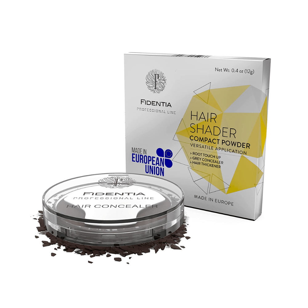 The Fidentia hair shader is a colored pigment powder that is applied to the hair and scalp with a sponge. Due to the high opacity, the hair shader lasts significantly longer than, for example, conventional eye shadow. By applying the hair shader, unsightly, regrowing hairlines and gray hair can be concealed. As a hair thickener, the root powder shades the scalp and thereby reduces the shine through of the scalp. This makes the hair appear significantly thicker. Even a sparse hairline can be "filled in" with it. This provides the user with an effective and unobtrusive method of thickening the hair, which can be perfectly complemented with the Fidentia hair fibers.